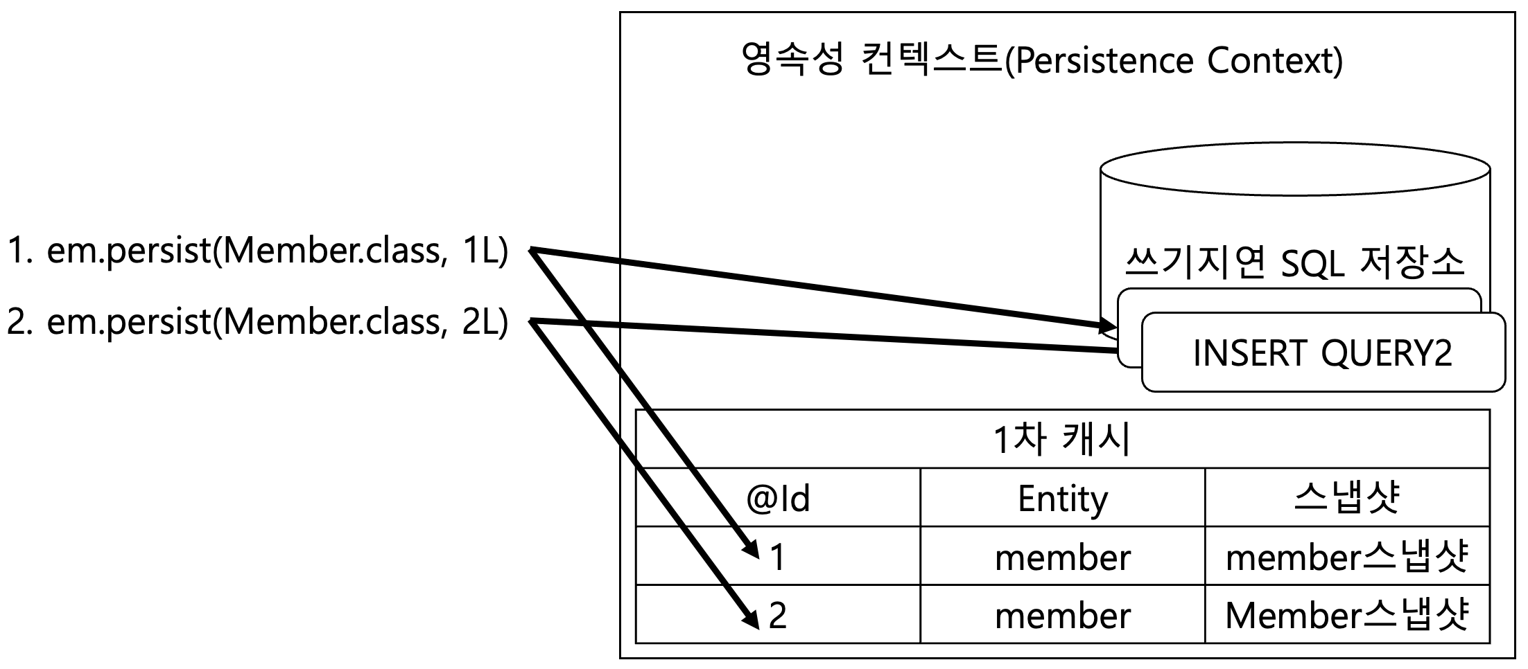 memberA를 persist 하는 순간, 1차 캐시에 넣고 쓰기 지연 SQL 저장소에 쿼리를 만들어 쌓는다.