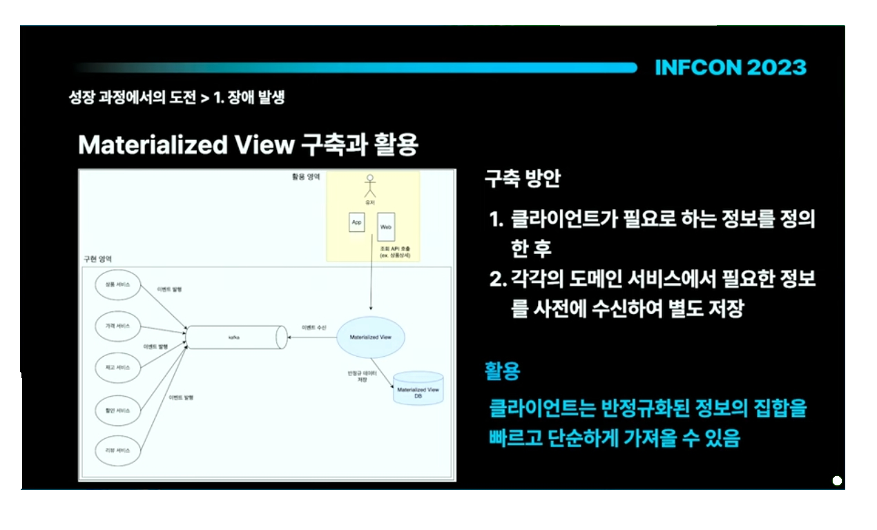 - 클라이언트가 필요로 하는 정보를 정의하고 각각의 도메인 서비스에서 필요한 정보를 사전에 수신하여 별도 저장 (실시간이 중요하기때문에, 배치보다는 비동기 메시징 기반의 갱신을 추천한다)