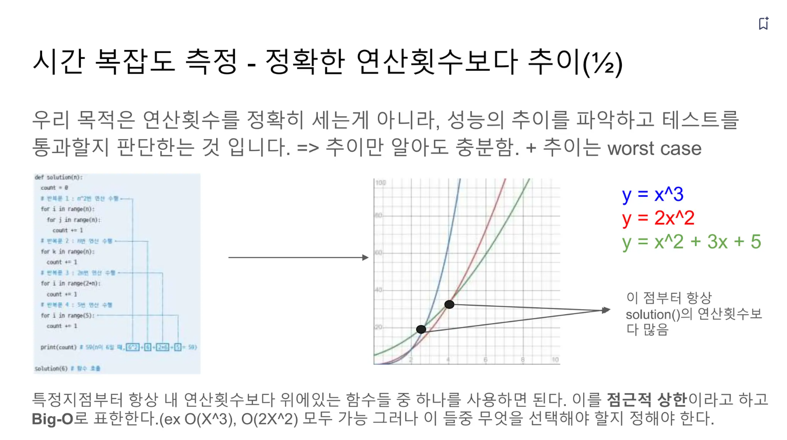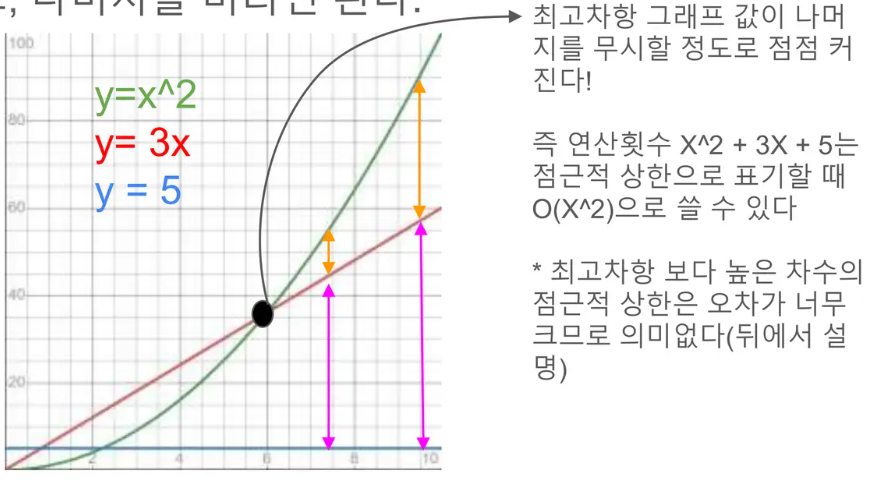 - 점근적 상한 : 특정 지점부터 항상 내 연산회수보다 위에 있는 함수들 중 하나를 사용하면 된다. (빅오 표기법을 사용한다)