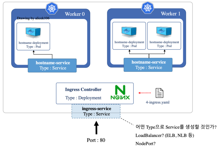 - 각 노드의 랜덤한 포트로 Nginx 인그레스 컨트롤러에 접근 가능