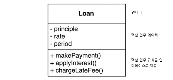 - 엔티티의 인터페이스는 핵심 업무 데이터를 기반으로 동작하는 핵심 업무 규칙을 구현한 함수들로 구성된다.
