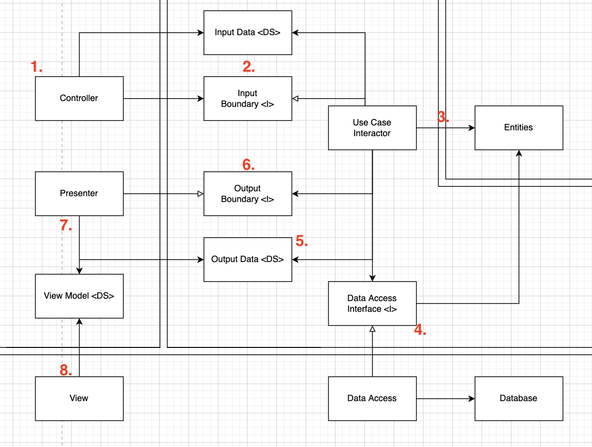 3, 4 UseCaseInteractor는 데이터를 해석 후 DataAccessInterface를 사용하여 Entities가 사용할 데이터를 데이터베이스에서 불러와서 메모리로 로드한다.